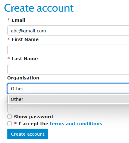 2. Enter your email address and add the other details. In this situation, you can only select Other for organisation.